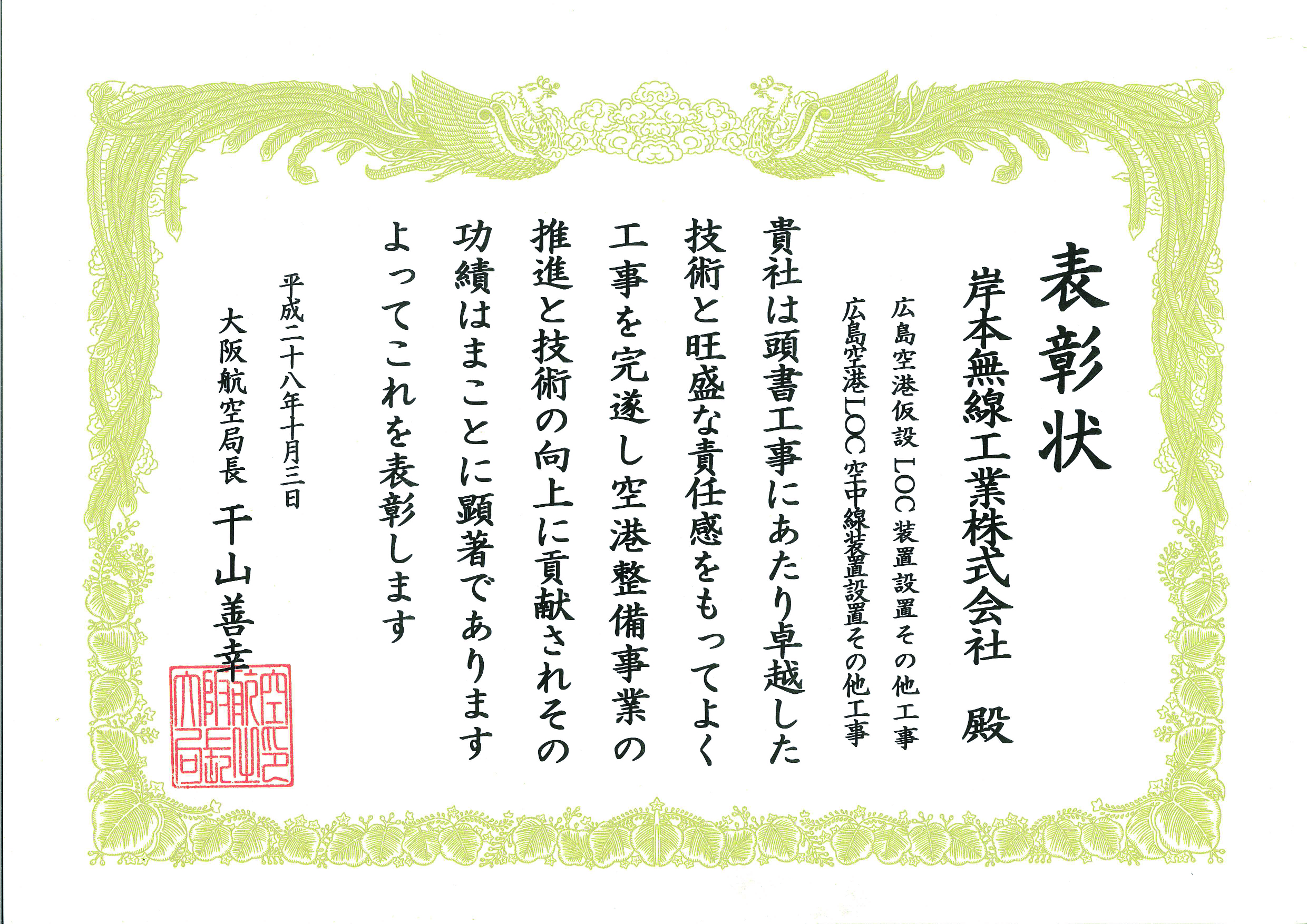 【表彰状】広島空港仮設LOC装置設置その他工事/広島空港LOC空中線装置設置その他工事